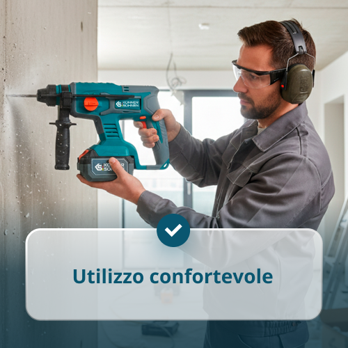 • Alta potenza e versatilità – trapano da 60 Nm con 2 modalità operative: foratura e avvitamento, e 23 impostazioni di coppia; smerigliatrice angolare con velocità regolabile 2500–10.000 giri/min; e martello rotante con energia d'impatto di 2 J e 4 modalità: foratura, foratura a percussione, martello con rotazione e solo martello – tutti gestiscono una varietà di compiti.